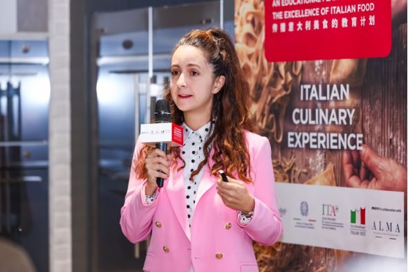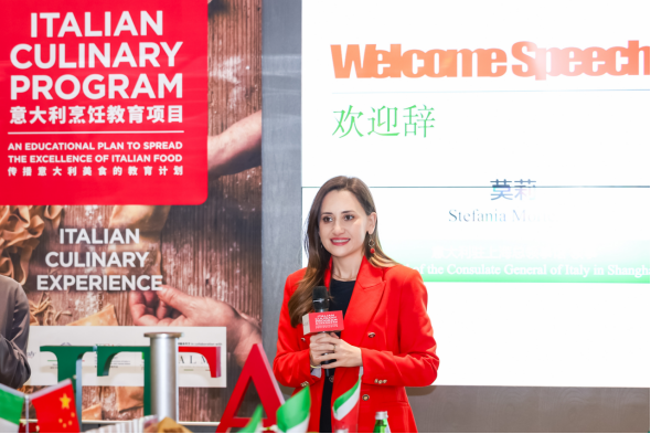 领事莫莉(Ms. StefaniaMortelliti)女士强调,意大利食材因健康、优质与丰富风味而广受国际认可,这些特点也与中国饮食对天然与平衡的追求高度一致。她表示,高校教师的到来为中意美食文化交流增添了新的活力,并期望大家能够将课程中获得的知识精准传达给学生,因为他们正是未来餐饮行业与食材文化传播的关键力量。