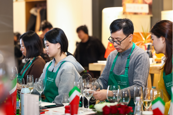 午后课程围绕意大利食材的风土体系展开,葡萄酒大师班、特级初榨橄榄油品鉴与松露体验依次进行,使学员在品鉴过程中深入理解地域食材的文化逻辑与质量标准。晚间的餐前酒会与意式晚餐以轻松方式延伸课堂内容,使参与者在感官体验中进一步感受意大利烹饪文化的魅力。